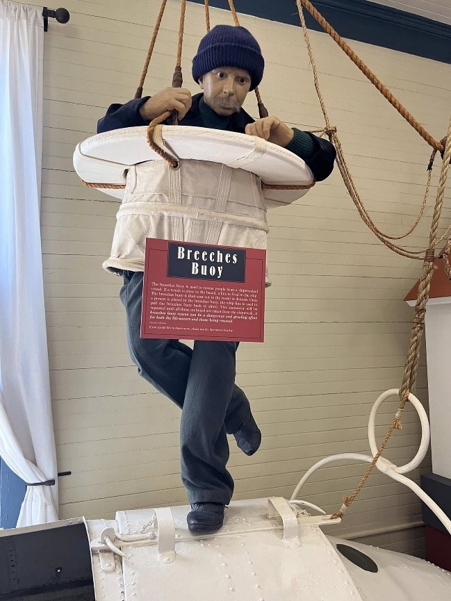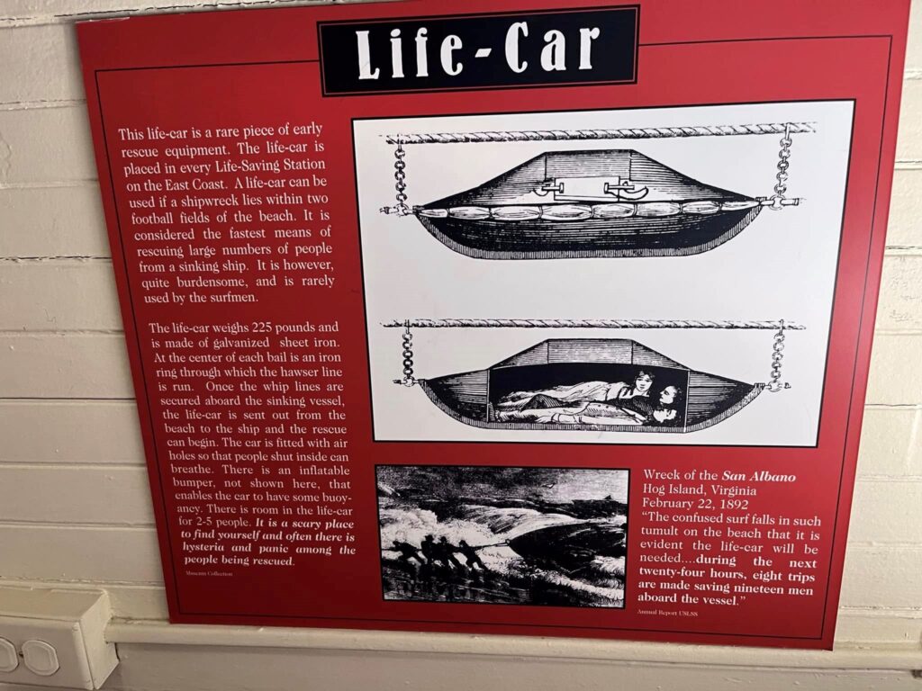 When a shipwreck was spotted and the crew notified, the life-savers would have to pull a heavy equipment cart to the site of the shipwreck. They used a Lyle gun to throw a rope to the ship (with accuracy to 300 yards). The gun alone weights 163 pounds. Once the line was established, the rescuers would send a breeches buoy out to the vessel, which would then be pulled back to the beach, rescuing one person at a time. The procedure would be repeated as often as necessary. It was hard work for the rescuers, and even worse in nasty weather (which, of course, is when many shipwrecks occurred). Occasionally, a life car would be used. It could hold 2-5 people and was used when a shipwreck was within 200 yards of the beach. The life car was used far less frequently than the breeches buoy because it was heavy (225 pounds) and cumbersome. It, too, needed to be sent out to the shipwreck via a whipline.